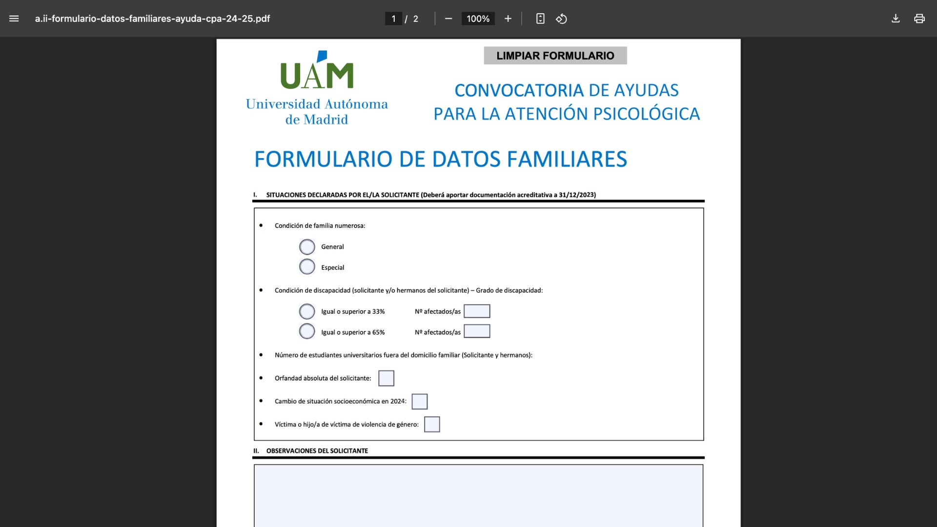 El segundo formulario es el relativo a los datos familiares.