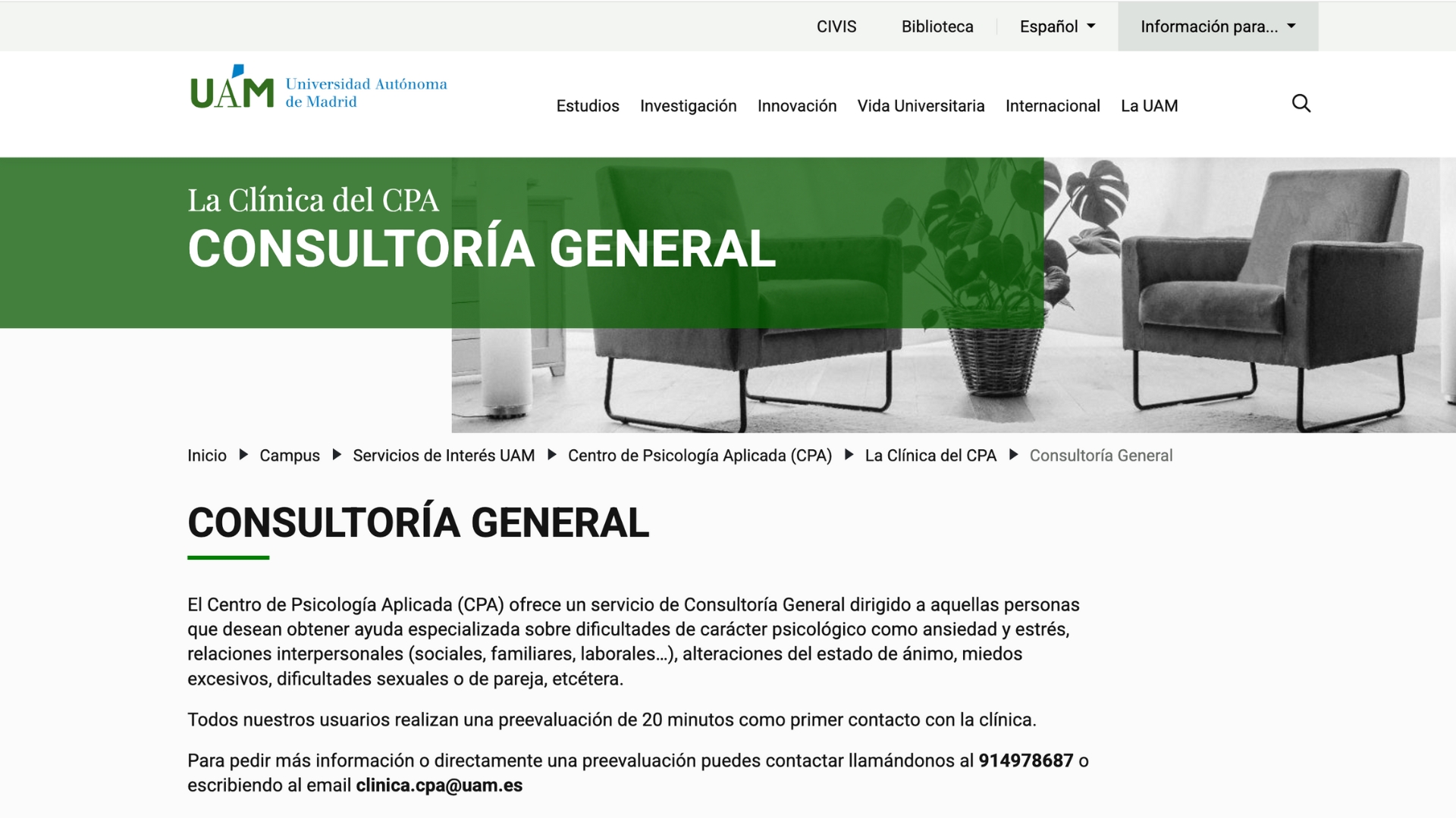 Puedes solicitar tu cita llamando al 914 97 86 87 o escribiendo un correo a clinica.cpa@uam.es.