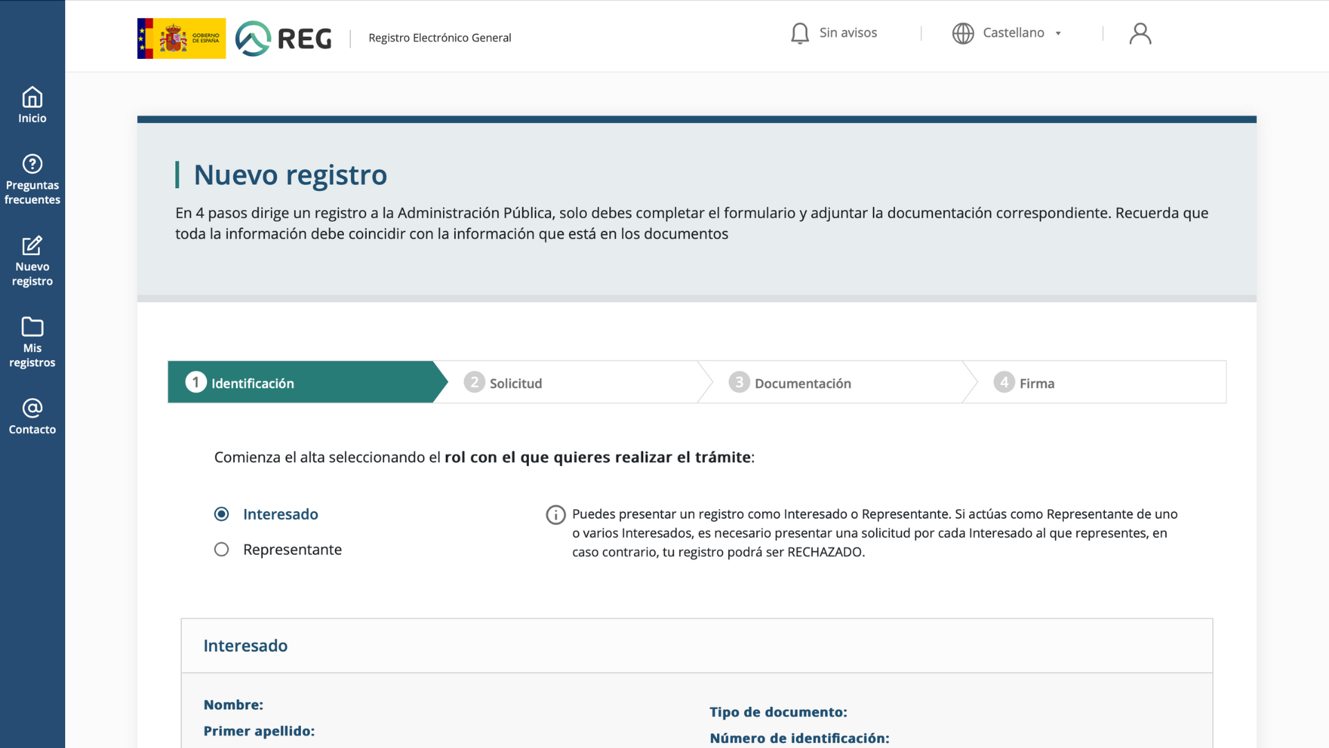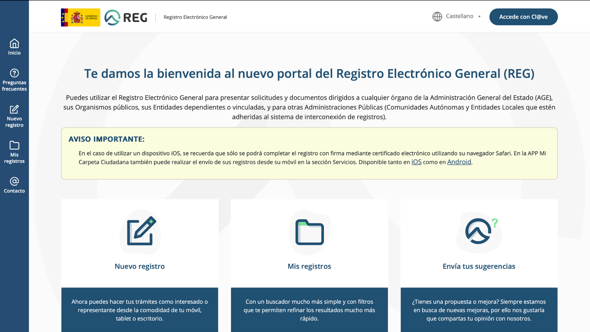 Entra en la web e identifícate con Cl@ve. Después, selecciona el apartado «Nuevo registro».